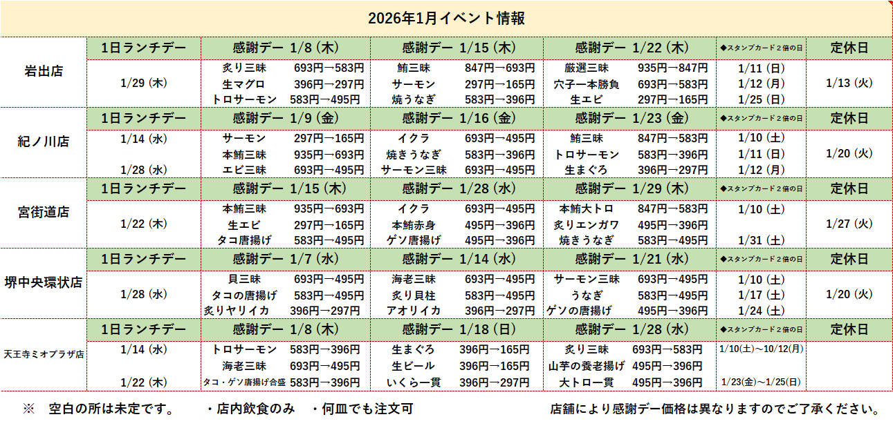 2025.12.26 お知らせ 2026年1月イベント情報 1月イベント情報 ご来店お待ちしております。 ・店舗により感謝デーの価格は事なります。・店内飲食のみです。(11:00~21:00) 前の記事 一覧に戻る 次の記事