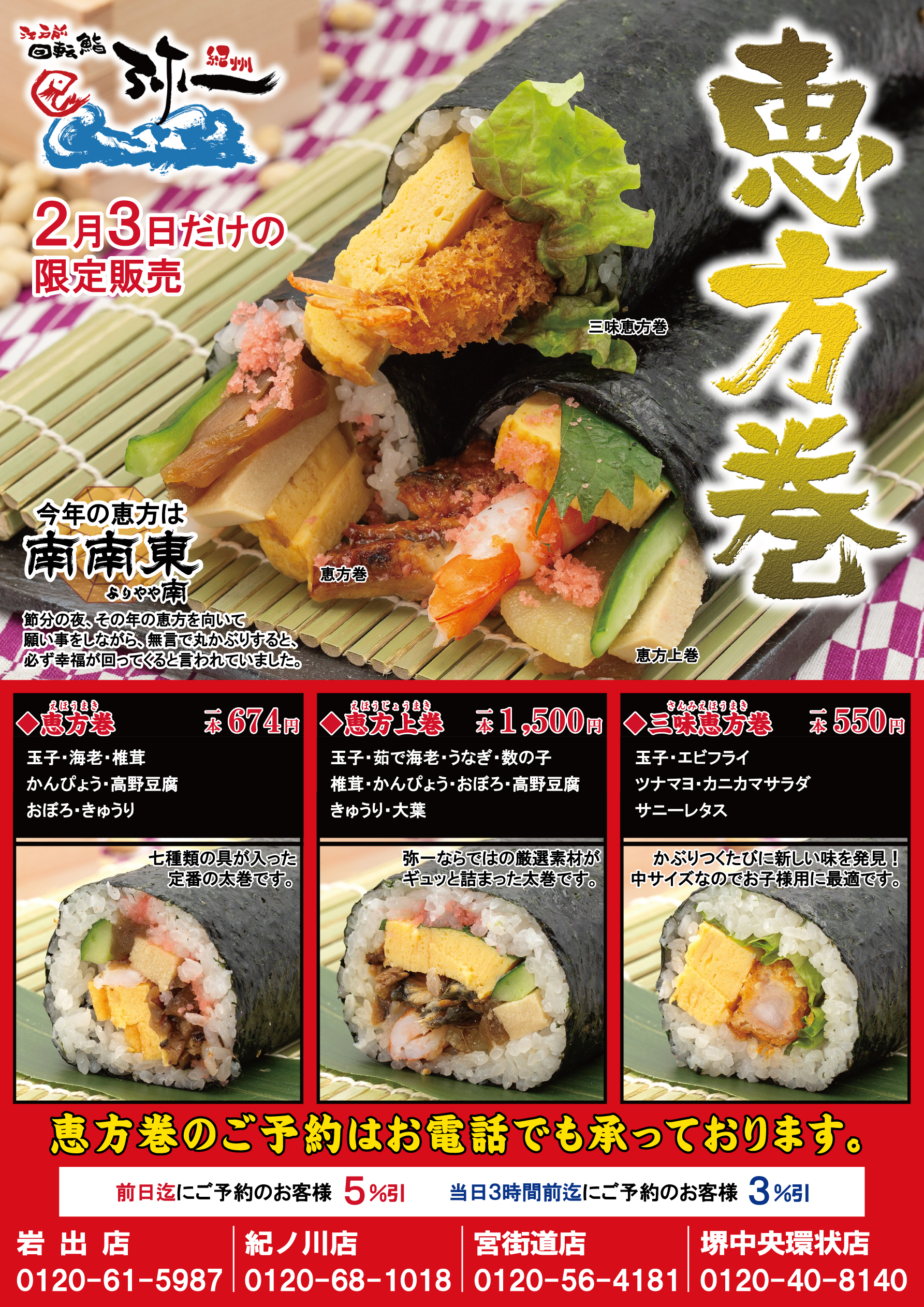 節分の夜、その年の恵方を向いて願い事をしながら、無言で丸かぶりすると、必ず幸福が回ってくると言われていました。
